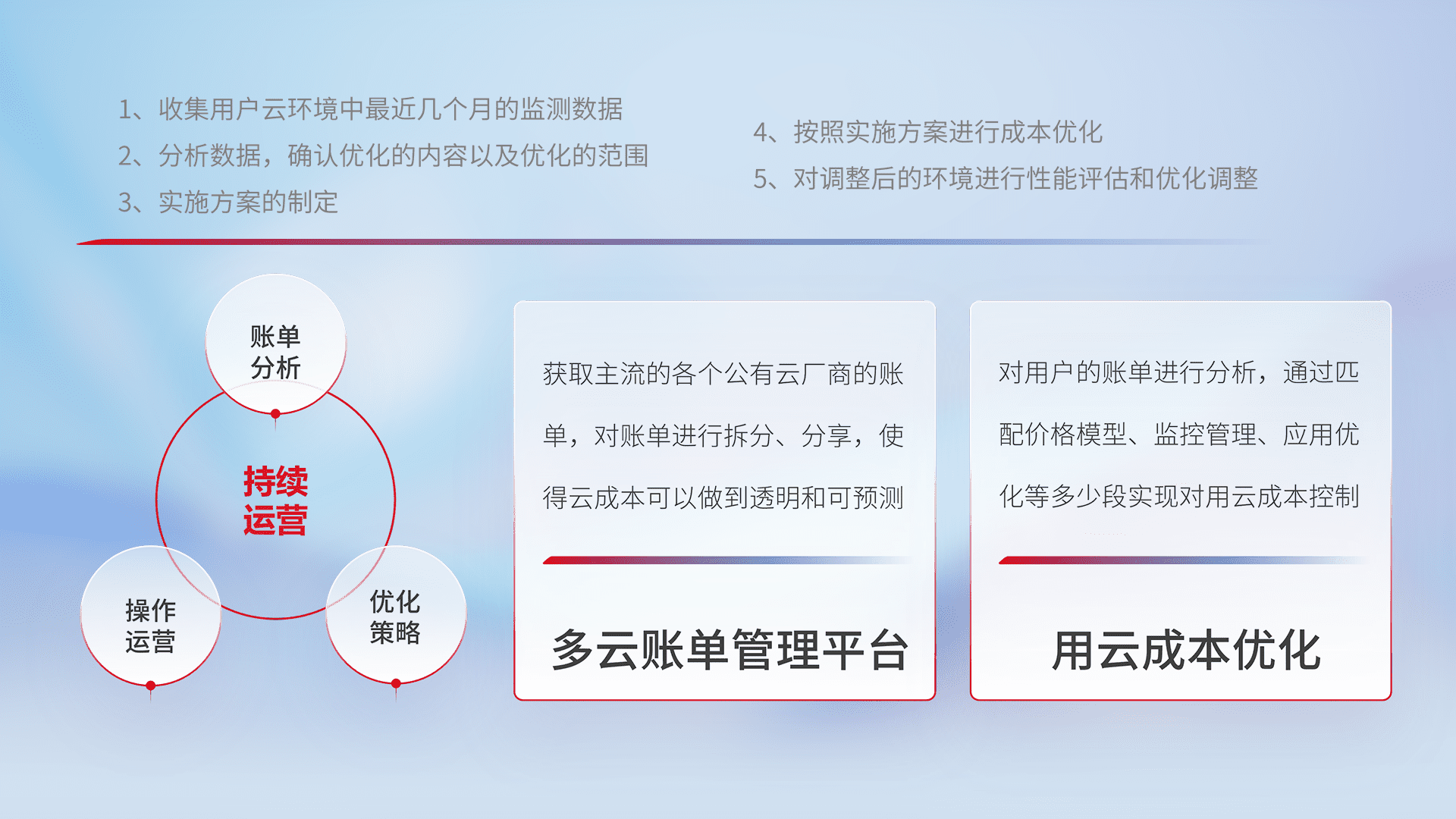 通过多云纳管,,以统一的资源数据模型把客户的云资源进行抽象和封装,,进而实现对多云资源的统一操作,,,保障云资源管理的可靠性、、、、稳定性与可用性。。。量身定制化运维内容,,,,配置、、、、开发运维、、、补丁管理、、、、备份、、、、监控、、认证和访问管理、、、审计和日常巡检等,,,保障在用云过程中的可靠度,,稳定度以及高可用率。。。
