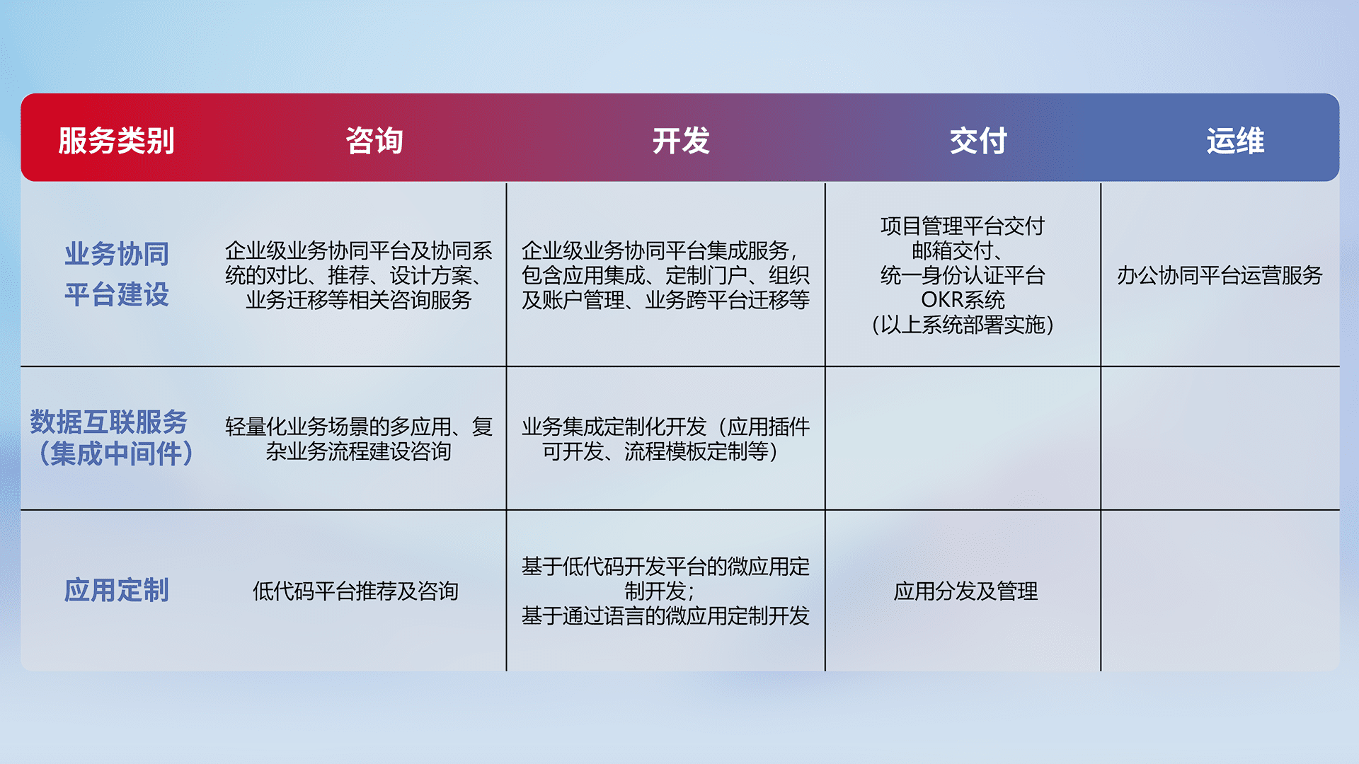 针对钉钉、、企微、、、、IDaas等平台级产品提供产品的规划、、方案、、、、交付、、、、定制化开发等服务,,实现如统一协同办公、、、、智能客户服务、、混合会议管理、、、智能数据查询、、、等业务场景,,,,实现数字化转型。。。。